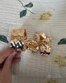 Vendo bracciale e spilla color oro in metallo, mai utilizzate. Entrambi hanno il loro sacchetto di plastica trasparente. Il bracciale può essere regolato a proprio piacimento. Li vendo perché non sono nel mio stile (non sono stati acquistati da me ma regalati). Attenzione: non inviare il numero di cellulare in chat, in quanto al momento non ho whatsapp, quindi un’eventuale vendita deve essere conlcusa qui. Grazie.
