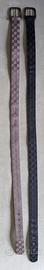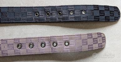 Coppia di cinture con decoro marca: Sisley La cintura di colore marrone è una taglia large (L) e ha una lunghezza di 108 cm La cintura di colore nero è una taglia extra large (XL) e ha una lunghezza di 112 cm Sono composte nella parte interna da P.V.C. mentre nella parte esterna da cotone e poliestere.