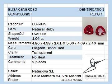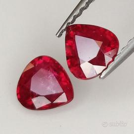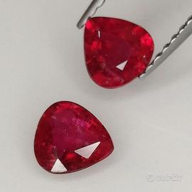 Coppia di Rubini 100% Naturali Eccellenti di colore 100% NON trattato sangue di piccione (pigeon blood), il massimo della qualità per i rubini Gemma: Rubino Naturale Peso: 1,06 ct Taglio: goccia / pera Misure: 4,80 x 4,98 x 2,61 e 5,06 x 4,69 x 2,46 mm. Colore : Sangue di Piccione ( Pigeon Blood ) Trattamento: nessuna indicazione di calore con lente d'ingrandimento 10x. 100%Untreated Trasparenza: trasparente Allego il certificato dove sono evidenziate queste caratteristiche veramente eccellenti. Coppia di Rubini Naturali di qualità altissima, ideale per creare un paio di orecchini montati su oro