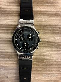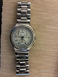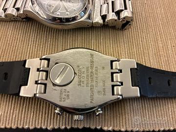 Vendo coppia di orologi Swatch anni 90 1-Orologio Swatch Irony Chrono Windfall. Il numero di riferimento è YCS410GX. È uscito nel 1999 ed è rimasto in produzione per circa 10-15 anni. •Cronografo •Cassa in acciaio inossidabile •Cinturino flessibile nero 2-Orologio Swatch Irony Chrono 'Rough & Rugged', modello fuori produzione del 1995, in ottime condizioni. • Colore: argento e grigio • Dimensioni della cassa: 43 mm. • Funzioni: cronografo, secondi su quadrante piccolo, indicatore del numero del giorno. • Cassa in acciaio inossidabile • Cinturino originale flessibile in acciaio argentato.