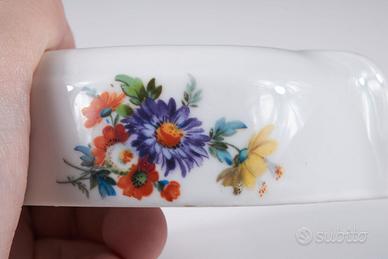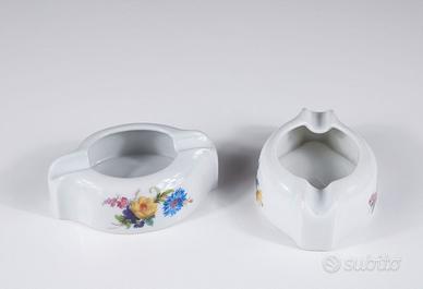Coppia di portacenere italiani degli anni ’20, periodo in cui la porcellana decorata era largamente impiegata sia in ambito domestico sia nella piccola hotellerie e nei salotti borghesi. Oggetti funzionali ma curati, pensati per stare in vista e dialogare con l’arredo.