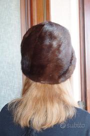 Copricapo da donna in pregiata pelliccia di visone naturale, color marrone scuro con riflessi lucidi naturali, elegante e caldo, morbido al tatto, vintage anni 70/80. Interno foderato in morbido raso tono su tono. Confezionato da artigiano pellicciaio, su misura dell’utente. Circonferenza cm. 56 circa. Come nuovo, indossato pochissimo. La pelliccia è morbida, non perde pelo e non presenta segni di usura.