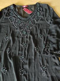 1 nero con stampe azzurro e rosa, applicazioni di fili argentati e paiettes, manica 7/8, euro 8