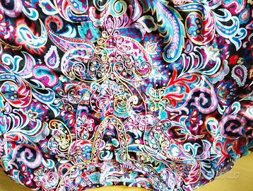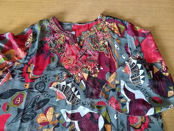 1 sfondo grigio con stampe rosso e bordeaux, applicazioni di fili argentati e paiettes, con manica s 7/8, euro 8