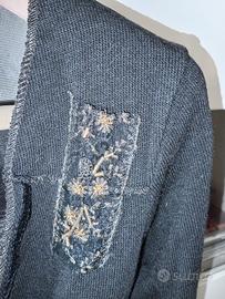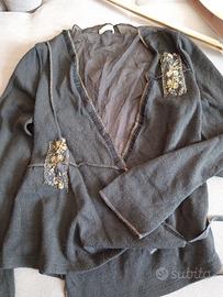 Coprispalle elegante nero con dettagli dorati sul davanti, polsini con profili dorati, si allaccia ad incrocio sul didietro. Il retro del giacchino è in tulle nero trasparente. Tessuto in lana e tulle. In ottime condizioni