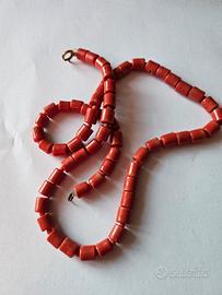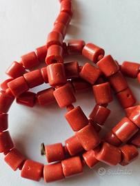 61 barilotti di corallim hubrium del Mediterraneo. lavorato dalle sapienti mani degli artigiani di Torre del Greco. ciascun barilotto misura circa 45mm per 90mm. la collana che,essendo antica,va fatta rifilare a proprio piacimento, comprende anche 37 perline rotonde piccole della stessa qualità di corallo. esse sono usate per differenziare un barilotto dall'altro. il valore è la qualità eccellente del corallo. può essere fatto montare per orecchini, bracciali, spille,ciondoli e collana . a proprio piacimento. pesa 46 grammi, come si evince da foto. il prezzo è di poco più di 50 euro a grammo