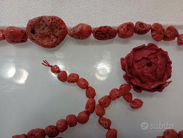 pezzi irregolari, alcuni scolpiti (es. fiore/rosa in corallo), altri forati per infilatura;