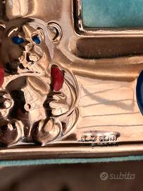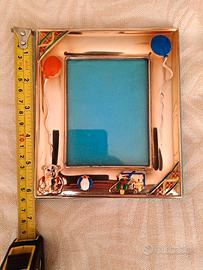 cornice portafoto con finiture argentate, decorazioni a tema infantile con orsetto,palloncini e giostra.