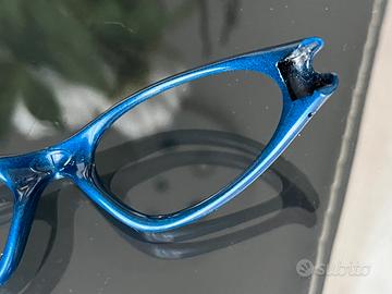Colore blu metallizzato raro. Montatura in buone condizioni, senza crepe o rotture, normali segni del tempo. Logo Oakley presente.