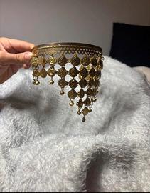Copricapo etnico berbero artigianale in metallo dorato con monete pendenti, utilizzato come accessorio per capelli o fronte durante cerimonie, feste e abiti tradizionali.