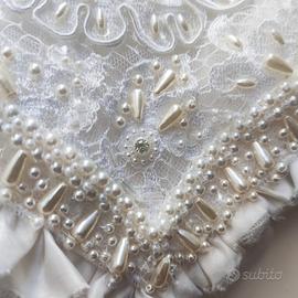 Prezioso corpetto da sposa di Val&Max. Pizzo francese Valenciennes rebrodè, impreziosito a mano da perle tonde a goccia e cristalli luce. Scollatura a cuore , omerale. Indossato solo il giorno del matrimonio. Può essere inserito per dare vita ad un nuovo abito, o come secondo cambio per il taglio torta,ricostruendo solo la gonna (la mia rovinata causa foto). Veste una tg 40. Ma anche più.