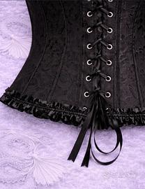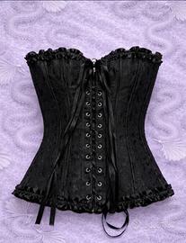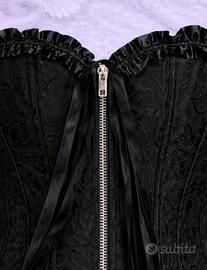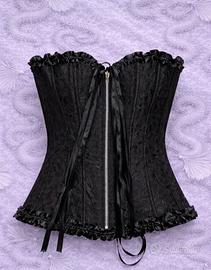 Corsetto nero stile goth elegante, modello bustier con zip frontale e lacci posteriori regolabili. Capo strutturato che valorizza la silhouette, perfetto per outfit alternativi, serate e look Y2K. ✨ Dettagli: Zip frontale pratica Lacci posteriori regolabili Tessuto lavorato con motivo elegante Bordi con volant Vestibilità aderente e modellante 📏 Taglia: L (40) 📦 Condizione: Ottimo stato Indossabile anche come top per: outfit goth / alt serate / eventi look Y2K / vintage 💬 Disponibile spedizione veloce 💥 Prezzo trattabile