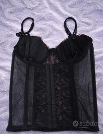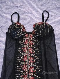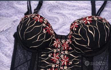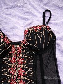 Corsetto nero elegante con ricami floreali rossi e dettagli in mesh trasparente, stile goth/punk. Modello strutturato che valorizza la silhouette, perfetto per outfit alternativi, serate, concerti o look edgy. 🔹 Ricami floreali rossi e dorati 🔹 Inserti in mesh trasparente sui lati 🔹 Spalline regolabili 🔹 Chiusura posteriore con gancetti 🔹 Coppe con ferretto (effetto push-up naturale) 📏 Taglia: S (36 / 8) 🎨 Colore: Nero e Rosso 🏷️ Marca: Vintage Dressing ✨ Stato: come nuovo Perfetto per chi ama stile goth, punk, dark, alternative fashion.