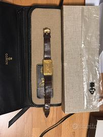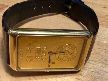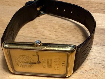 Orologio vintage a carica manuale ,anni80-90 cassain oro 18k,con quadrante numerato 2394 lingotto oro 24 k da 15 gr (999.9)e corona con diamante.con scatola e kit originali,perfettamente funzionante,cinturino originale Corum.Oggetto da collezione.