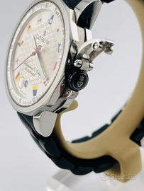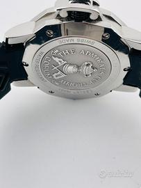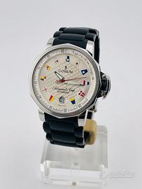 Corum Admiral’s Cup automatic ref. 082.833.20 risalente ai primi anni 2000, con cassa in acciaio da 41mm, quadrante bianco/silver con bandierine nautiche in smalto, bracciale in caucciù, chiusura deployante in acciaio e fondello con inciso il logo della regata Admiral’s Cup.