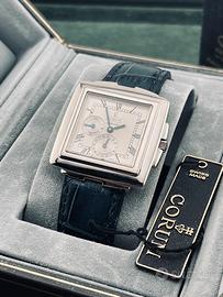 Quadrante argente’ con lavorazione guilloché, movimento automatico cal. Corum (su base Frederic Piguet 9641), corona, cinturino e fibbia (in oro) originali Corum.
