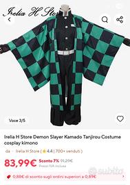 vendo cosplay originale di kamado tanjiro di demon slayer, provvisto di parrucca, calze nere giapponesi per sandali ,cintura ,completo nero +giacca a scacchi nero/verde , orecchini che si accangiano all'orecchio senza che quest'ultimo abbia i buchi (tipo a pinza regolabili in modo da non fare male), fasce bianche x le caviglie più i sandali taglia 42/43.