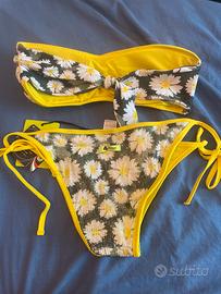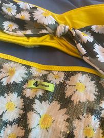 Costume in Lycra, bikini della 4 giveness fantasia margherite in paillettes giallo su sfondo verde militare, collezione di alessia marcuzzi, taglia L ma calza stretto, mai indossato nuovo con etichetta e venduto a metà prezzo, solo consegna a mano con scambio a roma centro o prati o balduina.
