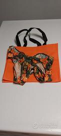 Costume bikini a fantasia fiori arancione, giallo, verde. Marca AnnaClub, taglia 44, perfettamente conservato. Venduto unitamente a sportina arancione per riporlo o per il trasporto.