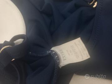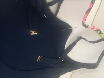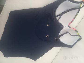 Bikini donna blu scuro imbottito con coppe, bretelline regolabili e dettagli fiori tropicali colorati e vivaci. Prodotto importato da Extre s.r.l. Taglia italiana EU 46/48 ( L/XL). Materiale in Poliammide ed Elastane. Chiusura a clip in oro pratica e veloce uguale quella dei reggiseni. Condizioni nuovo e senza difetti come da foto. Possibile trattativa