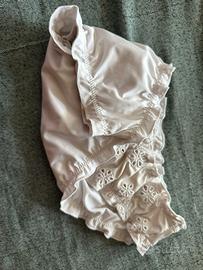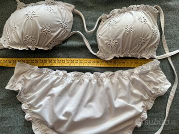 Bikini bianco con coppa rigida quadrata, rgolabile con laccetti utilizzabili per piu soluzioni (allacciati entrambi paralleli alla schiena, uno alla schiena e una al collo, etc).