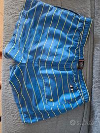 Costume uomo a pantaloncini di colore blu con strisce di colore giallo. Taglia XL nuovo Munito di due tasche e laccetto in vita per stringerlo