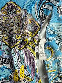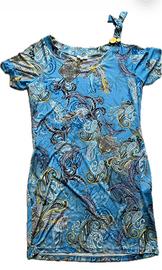 Set Mare Parah Impronte - Costume Intero + Copricostume Abbinato . Caratterizzato da una splendida stampa paisley (fantasia cashmere) nei toni dell'azzurro polvere, blu navy e tocchi di giallo ocra, perfetto per risaltare l'abbronzatura . Costume Intero: Modello dal taglio classico ed elegante. Presenta un dettaglio gioiello sullo scollo con due cerchi dorati che donano un punto luce sofisticato. Spalline confortevoli e ottima vestibilità modellante tipica del brand. Coppe preformate per un ottimo sostegno • Abito Copricostume a maniche corte in tessuto leggero e fluido. Riprende la stessa fantasia del costume e presenta un vezzoso nodo sulla spalla con dettaglio dorato coordinato. Ideale per il passaggio dalla spiaggia all'aperitivo.