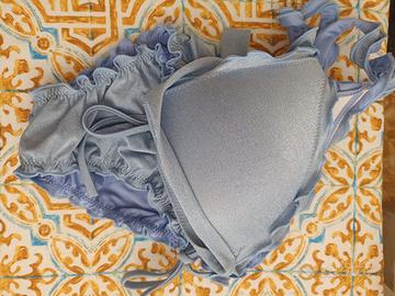 Costume da bagno indaco chiaro "brillantinato"; due pezzi di Calzedonia, taglia 38/40 (M). Il pezzo superiore si può agganciare sia a modo di "bikini" che annodandolo, come se fosse un reggiseno. Sia il pezzo sopra che il sotto sono regolabili perché si allacciano facendo un fiocchetto con i lacci quindi si adatta bene alle forme, ha un'ottima vestibilità. Ottimo per le sere d'estate per essere eleganti anche in costume.