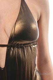 Costume da bagno intero, profondo scollo a V, tessuto con effetto laminato con un meraviglioso riflesso dorato, tg S, M, L, ideale anche come body o top sottogiacca per un look da sera sofisticato ed elegante, coppe imbottite ed estraibili in omaggio, laccetto sotto il seno per chiusura a fiocco sulla schiena, laccetto che gira intorno al collo, taglio sgambato, fodera interna, vestibilità regolare