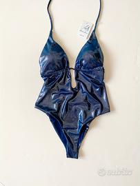 Costume da bagno intero blu notte, profondo scollo a V, tessuto con effetto micro beillantini, che dona un luccichio bellissimo, ideale anche come body o top sottogiacca per un look da sera sofisticato ed elegante, coppe imbottite ed estraibili in omaggio, laccetto sotto il seno per chiusura a fiocco sulla schiena, laccetto che gira intorno al collo, taglio sgambato, fodera interna, vestibilità regolare