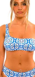 Monospalla con coppe imbottite, disegno blu con sfumature turchesi, estraibili in omaggio, chiusura a fiocco adeguabile a qualsiasi torace