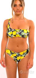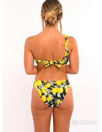 Monospalla fondo nero, limoni e foglie come fantasiea, con coppe imbottite, estraibili in omaggio, chiusura a fiocco adeguabile a qualsiasi torace
