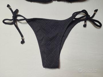 Bikini 2 pezzi con scollo all'americana e lacci laterali, in tinta unita (nero con ricami), taglia XS.