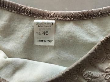 Costume da bagno marca "Sabbia Nera" (made in Italy) due pezzi, taglia 46, sgambato, con ferretto, annodato sul collo. Ricamo floreale tinta su tinta.
