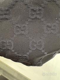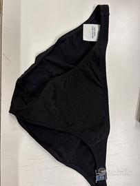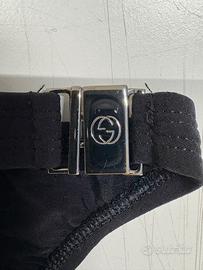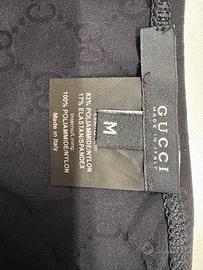 Costume da bagno in tessuto elasticizzato, firmato Gucci, con monogramma nero su nero come da foto. Da un lato si chiude con piccola fibbia con marchio. Taglia M,