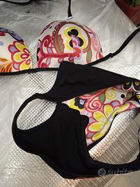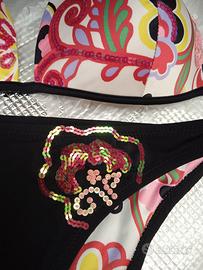 Splendido due pezzi ottima vestibilità da una 42 a una 46, mai usato, slip fondo nero con decorazioni in paillettes che richiamano la fantasia del reggiseno, veramente figuroso. Da vedere senza impegno. Occasione!!!