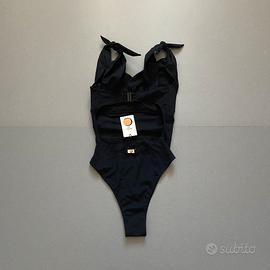 Tropic Of C Eden in black. Si tratta di un costume intero con dentro un corsetto ispirato ai costumi vintage con scollo drappeggiato e lacci sulle spalle. Realizzato in nylon rigenerato: 65% poliammide, 35% elastan. Taglia XS MA VESTE XXS.