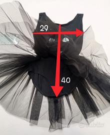 Composto da body nero elasticizzato che valorizza la silhouette, con musetto di gatto cucito sul petto e delicata gonnellina in tulle nero per un tocco giocoso ed elegante.