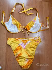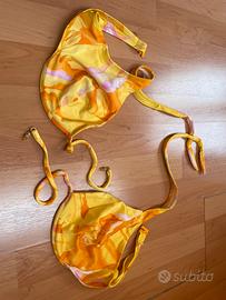 Costume giallo fantasia della lycra. Mutanda modello abbastanza sgambato. Reggiseno con laccetti da stringere al collo e regolabile davanti con lacci e gioiello da bellezza. Foderato non trasparente. Taglia 48 (IV). Il reggiseno ha i ferretti e non ha le coppe imbottite.