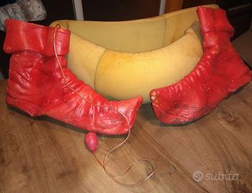 Costume da carnevale in Raso per Adulti Unisex "Gran Ciambellano". Produzione sartoriale (fatto a mano su disegno). -Pulito in lavanderia-. Corredato di: Costume multicolore, unico pezzo con cerniera sul retro, Altezza ml. 1,50/1,60 e larghezza massima della pancia cm. 60; Taglia 52/58; Panciotto in plastica morbida da inserire all'interno; Cintura multicolore; Cappello multicolore tondo con interno imbottito; Maschera con piume multicolore; Mannaia in plastica; n°2 Copri scarpe in plastica rossa, di cui uno fornito di foro di passaggio per lo schizzo d'acqua comandato dalla pompetta da poggiare all'interno delle tasche del costume.