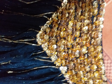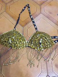Costume donna Odalisca, originale, ricchissimo di pailettes in metallo oro cucite una per una sia sul davanti della gonna che dietro. Top regolabile e comodo, anch'esso rivestito di numerosissime paillettes..... gonna regolabile e svasata, tagli a fazzoletto, uno a uno con spacchi .Stoffa con sottili righe in oro. Vestibilità dalla taglia 42 alla 48