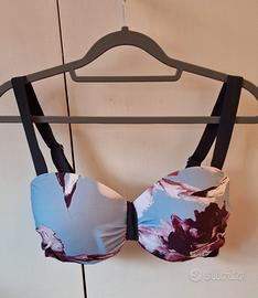 costume due pezzi Bonprix (bici selection) 80% poliammide e 20% elastan. slip alto con fascia e fiocco davanti, taglia 46 color antracite. reggiseno con coppe imbottite, taglia 46 (4d), spalline antracite e coppe azzurro carta da zucchero e fiori color vinaccia. mai indossato.