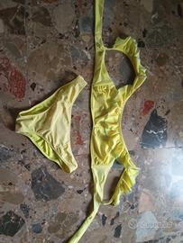 costume due pezzi donna taglia S/M il reggiseno è a top con volant e con cucitura turchese.ferretti laterali ed è praticamente perfetto.lo slip è leggermente scolorito ma comunque bello