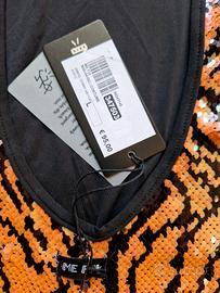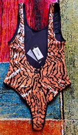 Bellissimo costume intero rivestito di paillettes by ME FUI Colore arancio con fantasia animalier Tg.L COMPOSIZIONE 100% Poliestere DETTAGLI jersey sintetico, paillettes, fantasia multicolore, interno foderato