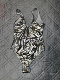 Vendo costume intero da donna color argento metallizzato, dal design moderno e brillante.