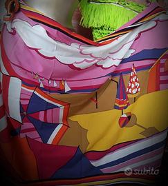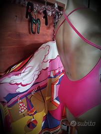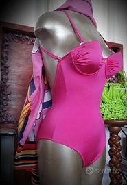 costume intero colore fucsia con coppe preformate e bretelline sottili coordinato con pareo puro cotone.