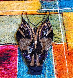 MODELLO INTERO CON SCOLLO A "V" ANTERIORE E SCOLLATURA POSTERIORE , APPLICAZIONE DI PAILLETTES