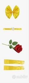 Il costume include abito giallo principessa, fiocco per capelli, girocollo, rosa e guanti gialli.