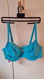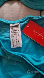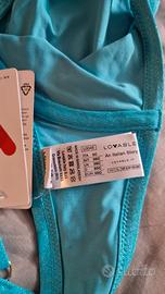 Costume due pezzi Lovable, azzurro brillante, tessuto lurex. 88% poliestere - 12 elastan Slip con arricciatura sui fianchi, taglia 4. Reggiseno con spalline e ferretti (no imbottitura) taglia 5C. Mai indossato