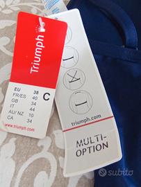 Costume intero marca Triumph, colore blu con profili bianchi nella parte superiore. Coppe leggermente imbottite, ottima vestibilità, possibilità di posizionare le bretelline regolabili in modo diverso. Taglia 44 italiana, mai indossato.